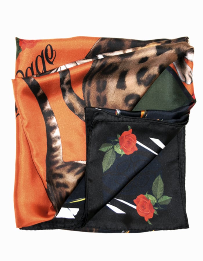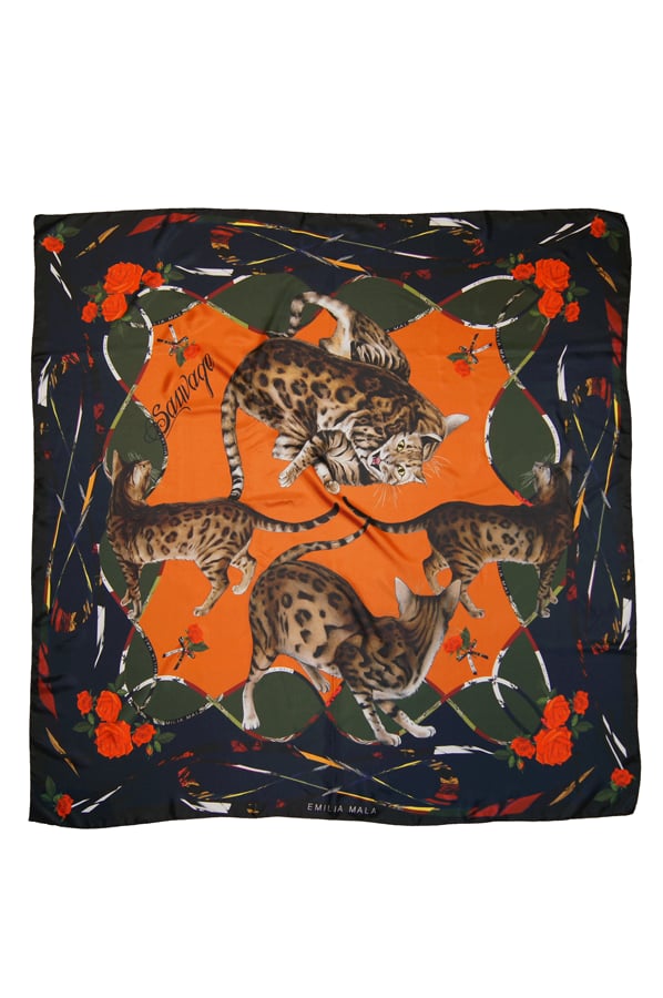 A large size colourful and elegant scarf. This scarf features a group of bengal cats surrounded by Emilia Mala signature ribbon and roses. It is made from luxurious soft silk twill that drapes beautifully and has hand finished rolled edges.